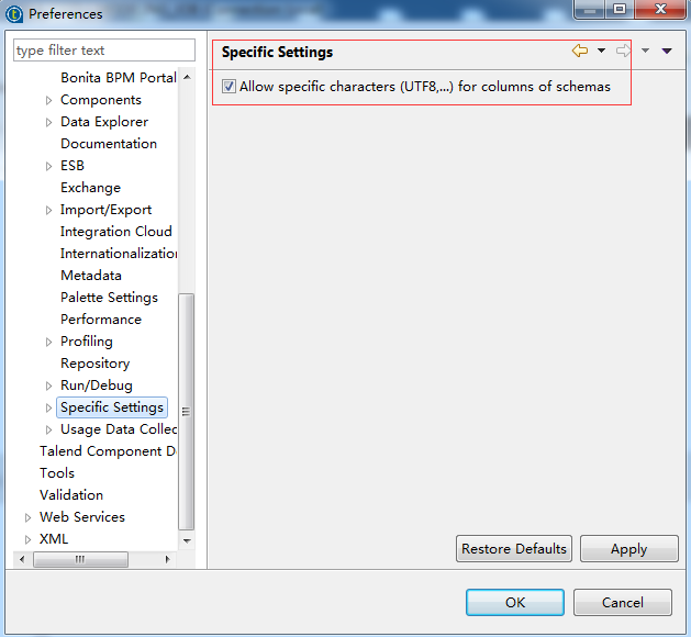1 打开Window-Preferences-TalendSpecific Settings, 勾上选项 ”Allow specific